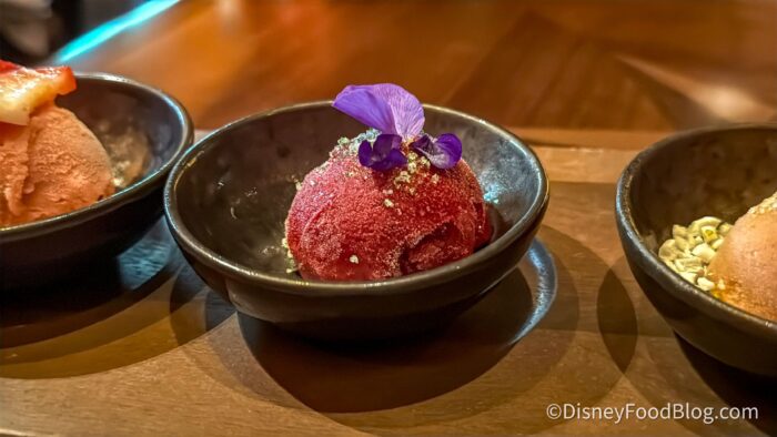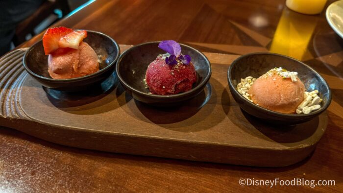 Finally, we ended on the Seasonal Sorbet Trio for $11, which features their Tiffins signature sorbet trio and is also plant-based. The three flavors were Strawberry Pink Peppercorn, Blueberry Yuzu with Shisho Sugar, and Apricot Orange Pistachio.