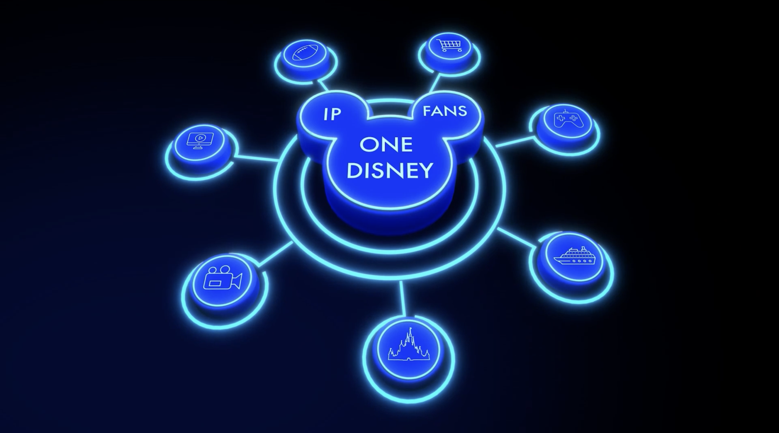 The Mickey icon in the middle features “IP and “Fans” as the two ears, with “One Disney” as the head.