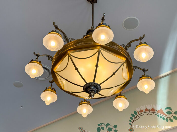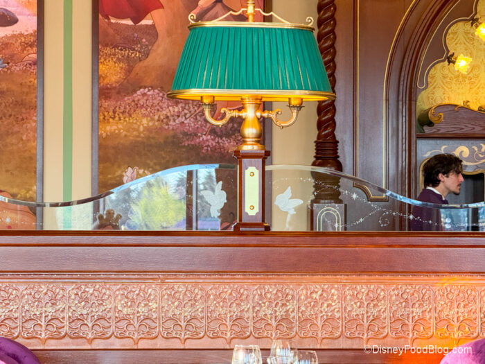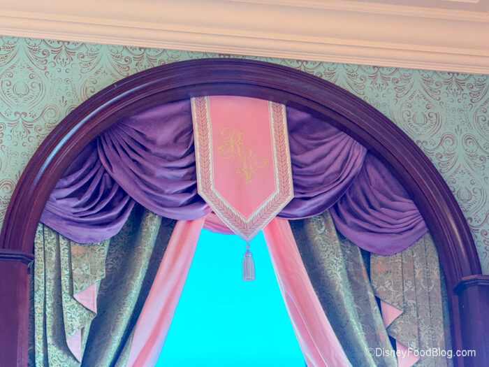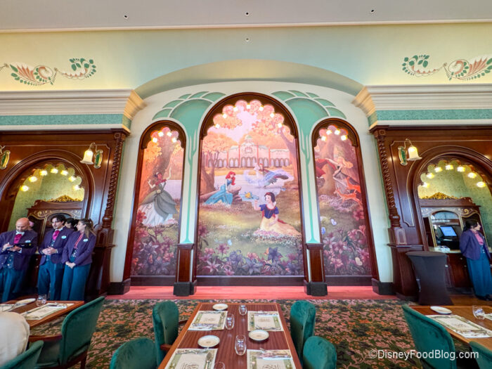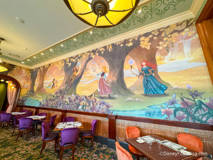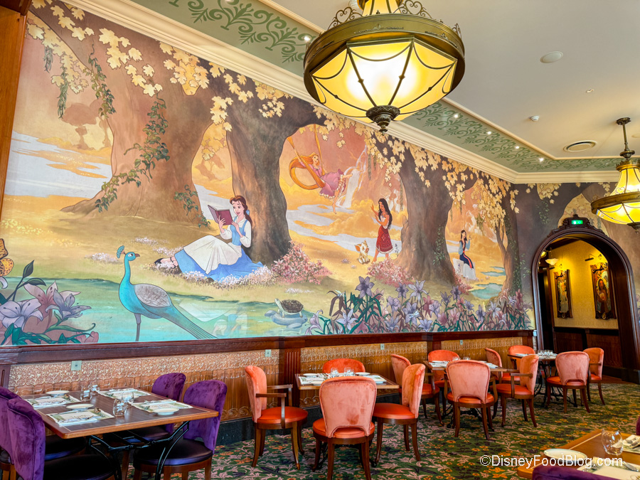 Now onto the amazing space! The whole restaurant is decorated to be royal and refined with embroidered drapes, floral tapestries, wood moldings, and murals of Disney Princesses. Just look at this gorgeous mural. We also love the velvet upholstery on the chairs.