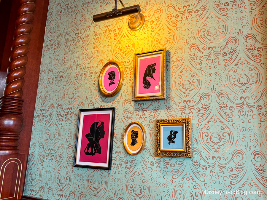 You’ll find classic silhouette portraits of the Princesses hanging on one wall. These remind us of the paper silhouettes you can get on Main Street, U.S.A.