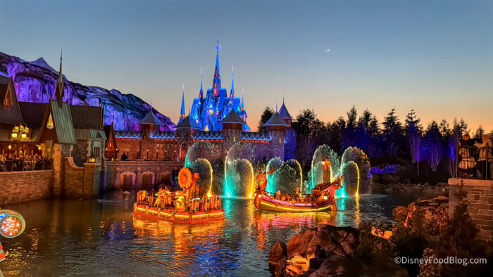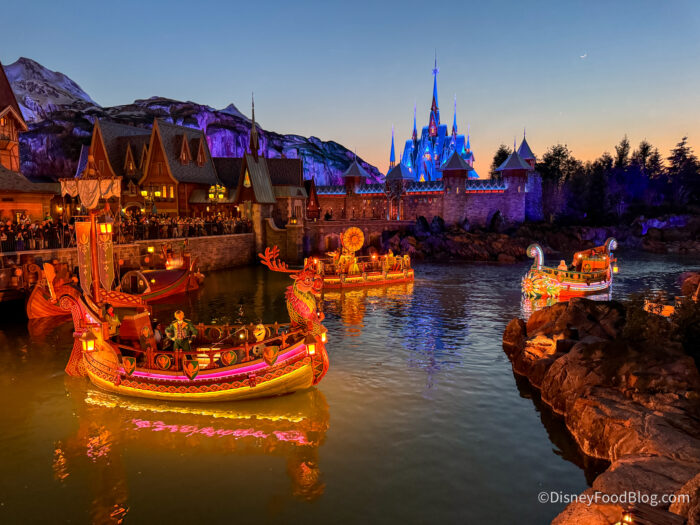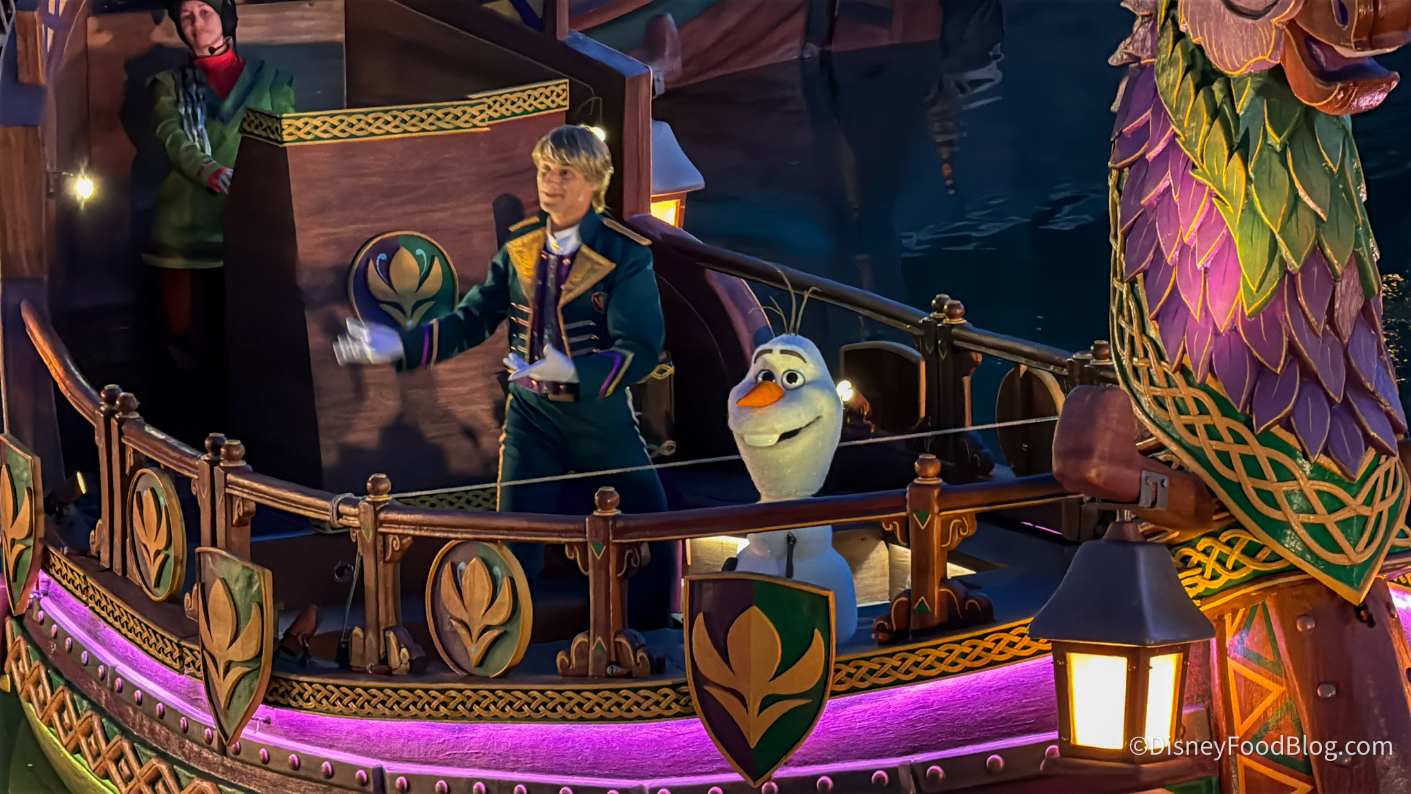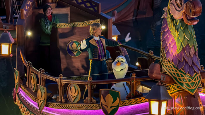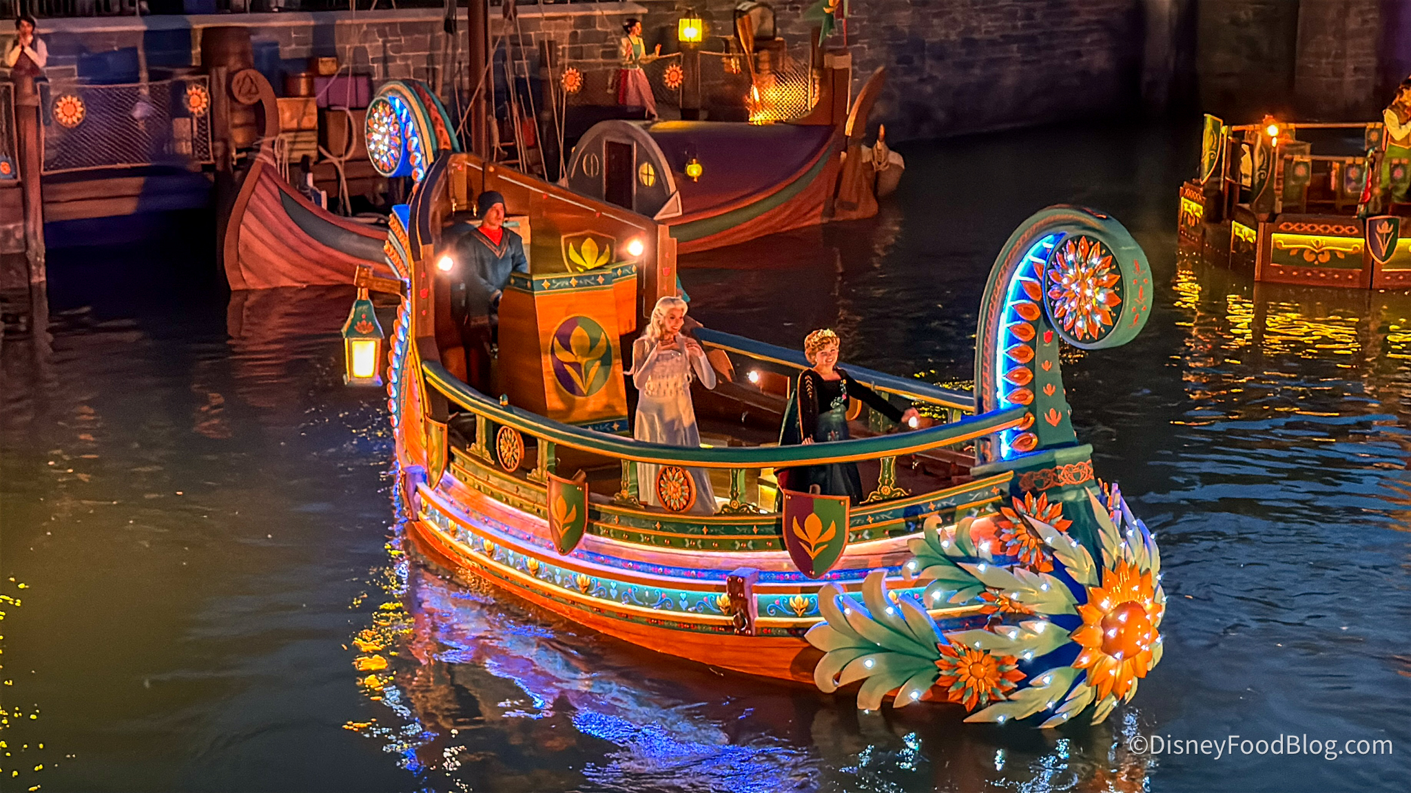 One of the things we were most excited for was A Celebration in Arendelle, which is a show that happens nightly in the new land. It takes place on the harbor, entirely in boats, and we absolutely loved this show! Olaf and Kristoff come out on the first boat, where you’ll hear Olaf speaking English and Kristoff speaking French, and they set the story of the show, which is that Olaf has been put in charge of decorating for the Snowflower Festival. Olaf looked AMAZING on that boat — we were blown away by how realistic he looks, and how well he moves! We did hear that B-mode for Olaf in this show, meaning that robot Olaf isn’t working, is a puppet, so it’s possible you may see that instead of robo-Olaf on your trip.
