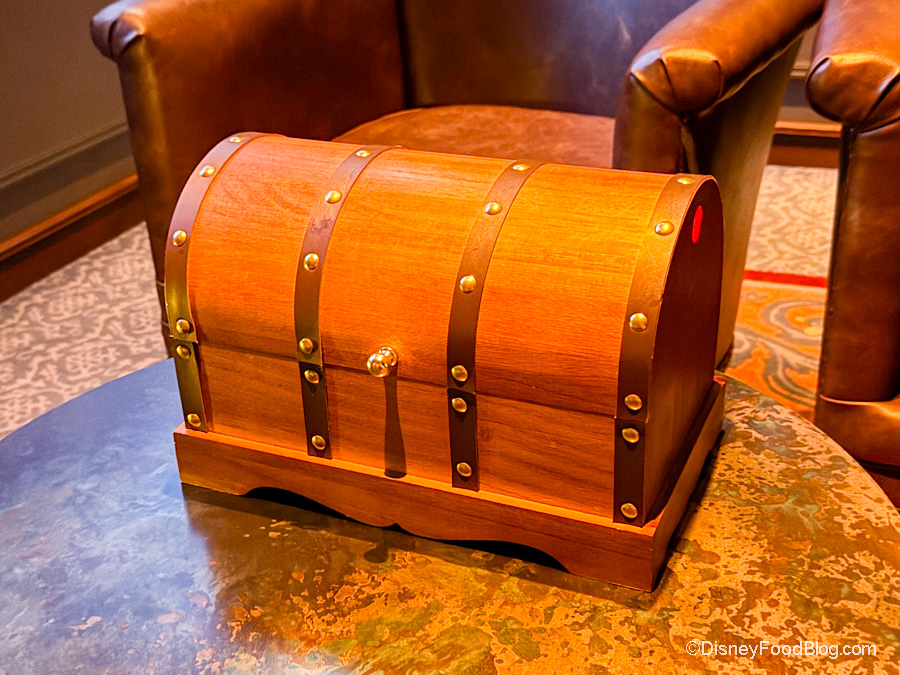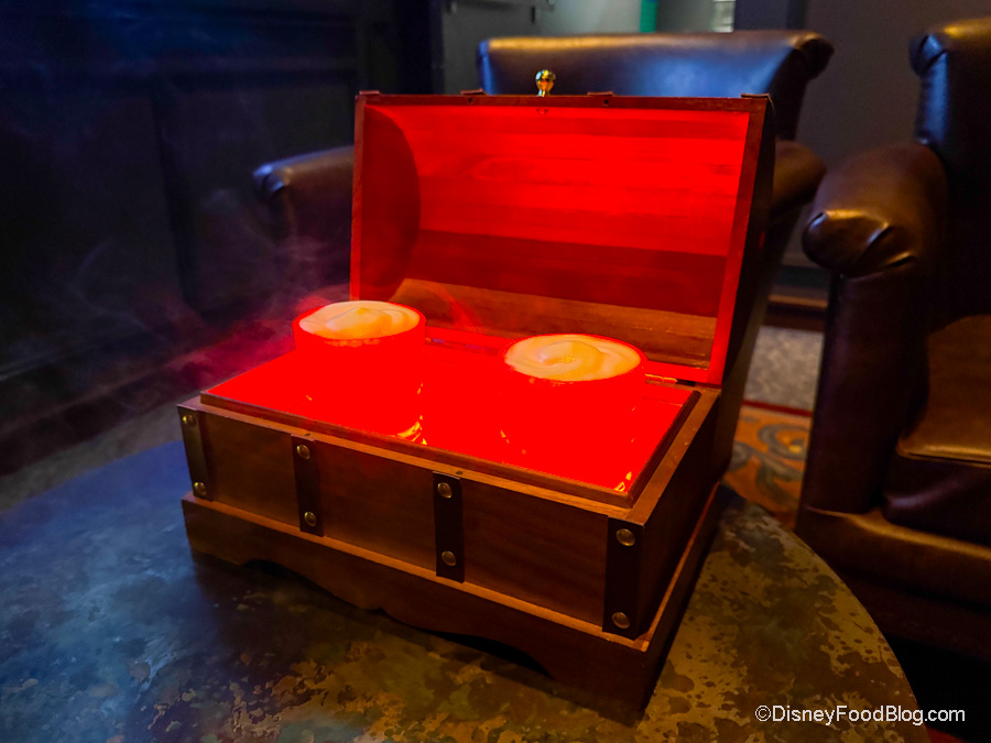 When you open the chest, there’s smoke and lighting effects, and your drinks look like something straight out of a movie. Honestly, we didn’t really get Captain Hook vibes with this. It’s more Pirates of the Caribbean to us, but it’s still piratey…and that’s what counts. Who’s to say Hook and Sparrow haven’t run into each other at some point, right?