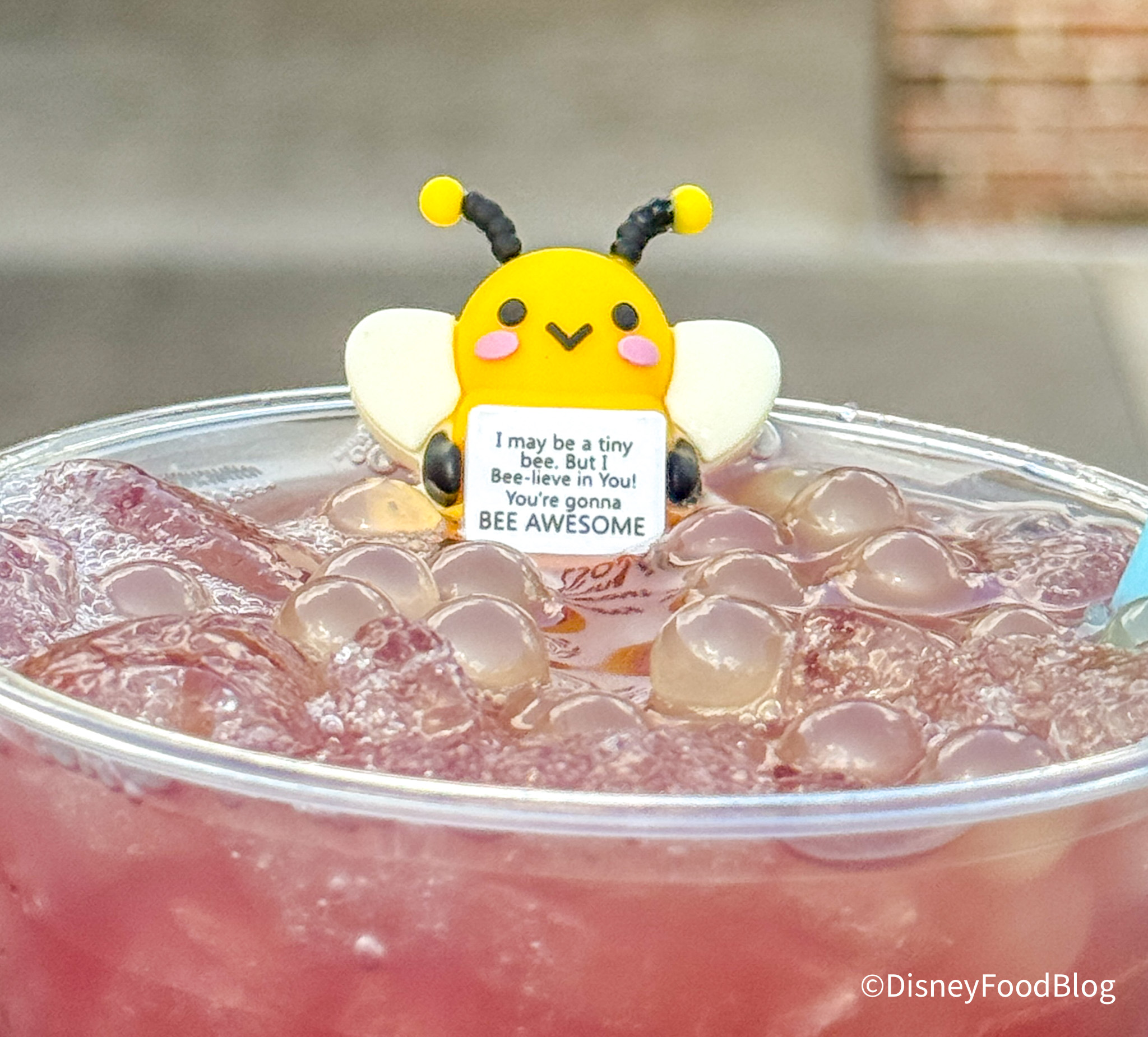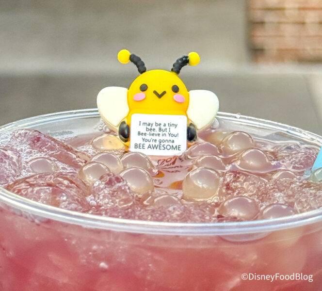 And, to round everything out, we also recently tried the Queen Bee cocktail for $15.95. This is made with apple vodka, peach schnapps, pineapple juice, and cranberry juice with honey boba pearls — and it comes with a cute little bee friend!