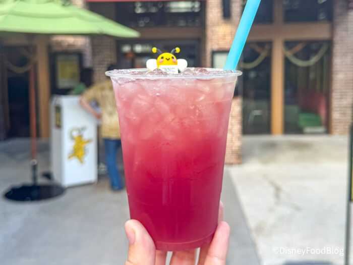 This was very delicious — sweet but not overbearing. We could definitely taste the pineapple juice and the green apple the most, with a hint of peach, but we didn’t taste a ton of alcohol, which we appreciated. The popping pearls were also very good, adding some sweetness on top. We wish that it were served with a more appropriate straw for popping pearls, but that would be a pretty big straw for an alcoholic drink. The highlight for us was the silly little bee. Very refreshing on a hot day — we would definitely recommend it to other people.