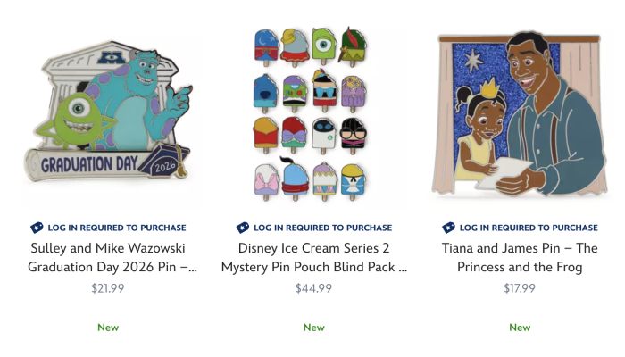 We definitely know a few special grads who need this Sulley and Mike Graduation Day 2026 Pin! It’s a great gift for that incredible day, and obviously, Mike and Sulley are our favorite college students. There’s also a new Ice Cream Series 2 Mystery Pin Pouches and this Tiana and James Pin from Princess and the Frog.