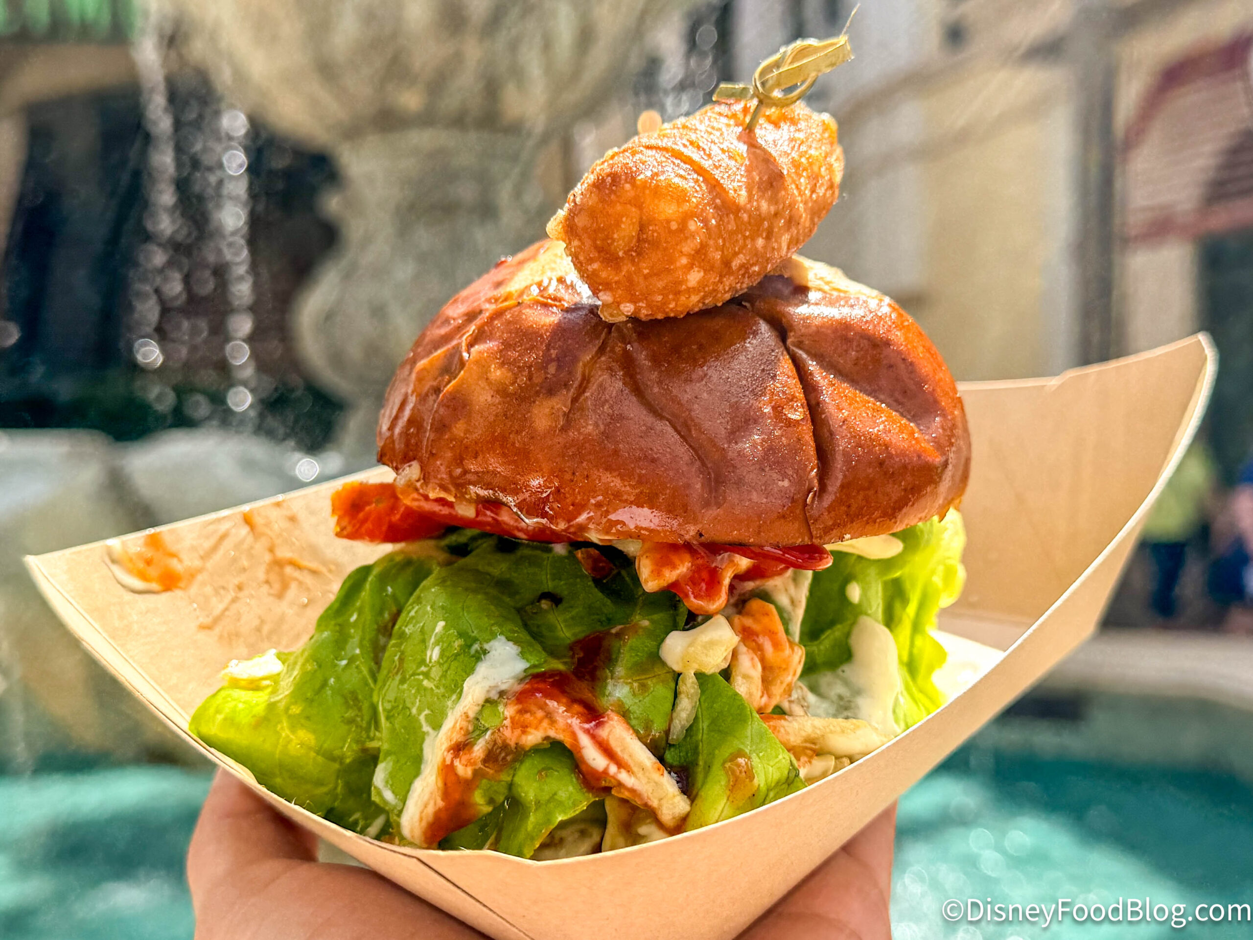 The Not So Polite Burger is $23 at The Polite Pig in Disney Springs. This is a burger with a beef and pork patty between a pretzel bun, packed with lettuce, tomato, potato sticks, onion rings, green sauce, Layla’s BBQ sauce, and topped with a tequeño. This guy is stuffed!