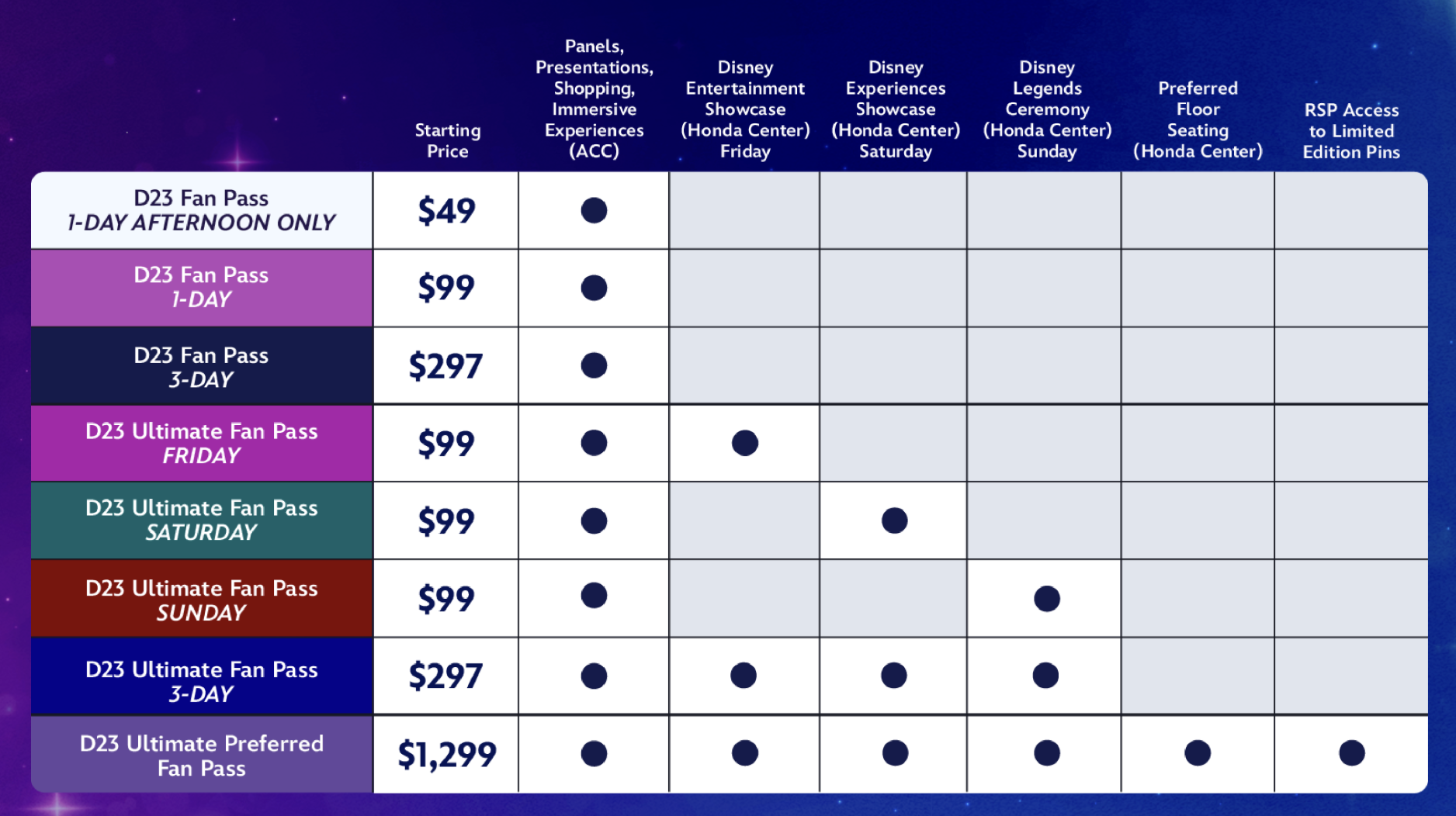 The D23 Fan Pass allows entry to the panels, presentations, shopping, and immersive experiences at the Anaheim Convention Center, and you can select the ticket for an afternoon, a single day, or 3 days. The afternoon option is the biggest change for this year!