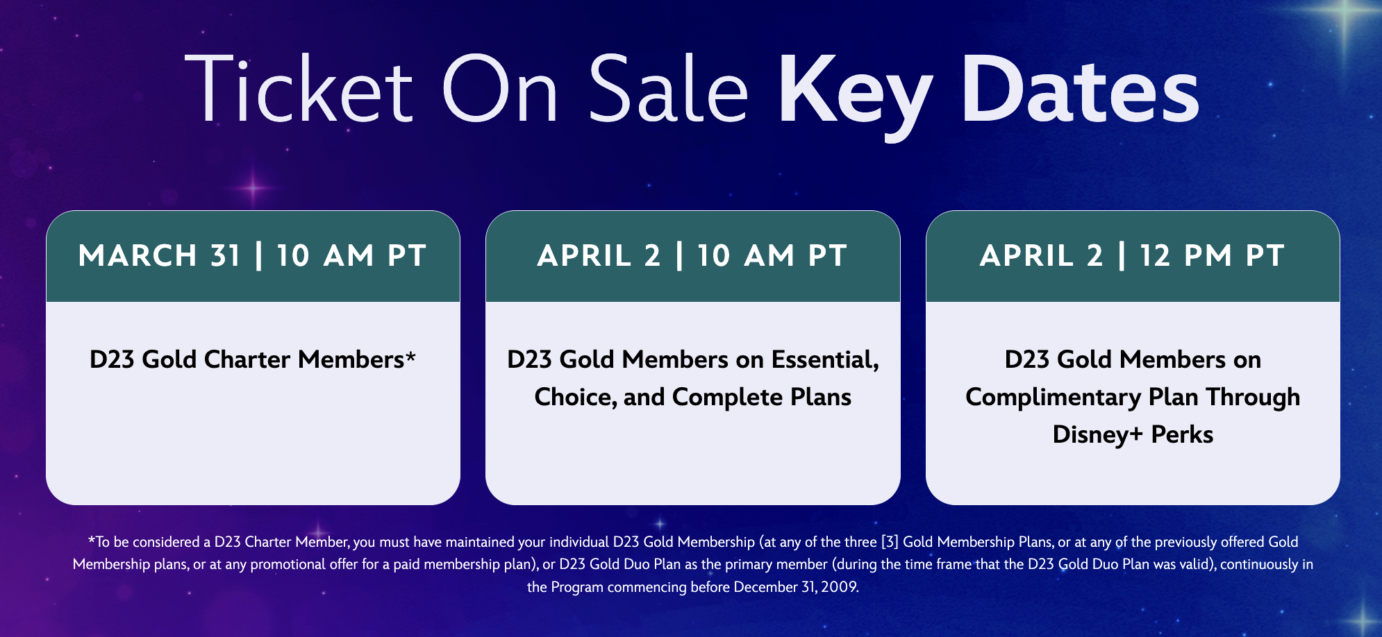 D23 Gold Charter Members can purchase their tickets starting on March 31st at 10AM PT. After that, Gold Members on Essential, Choice, and Complete plans can purchase April 2nd at 10AM PT. The final tier of ticket sales opens at 12PM PT on April 2nd, for D23 Gold Members with complimentary plans through Disney+ perks.