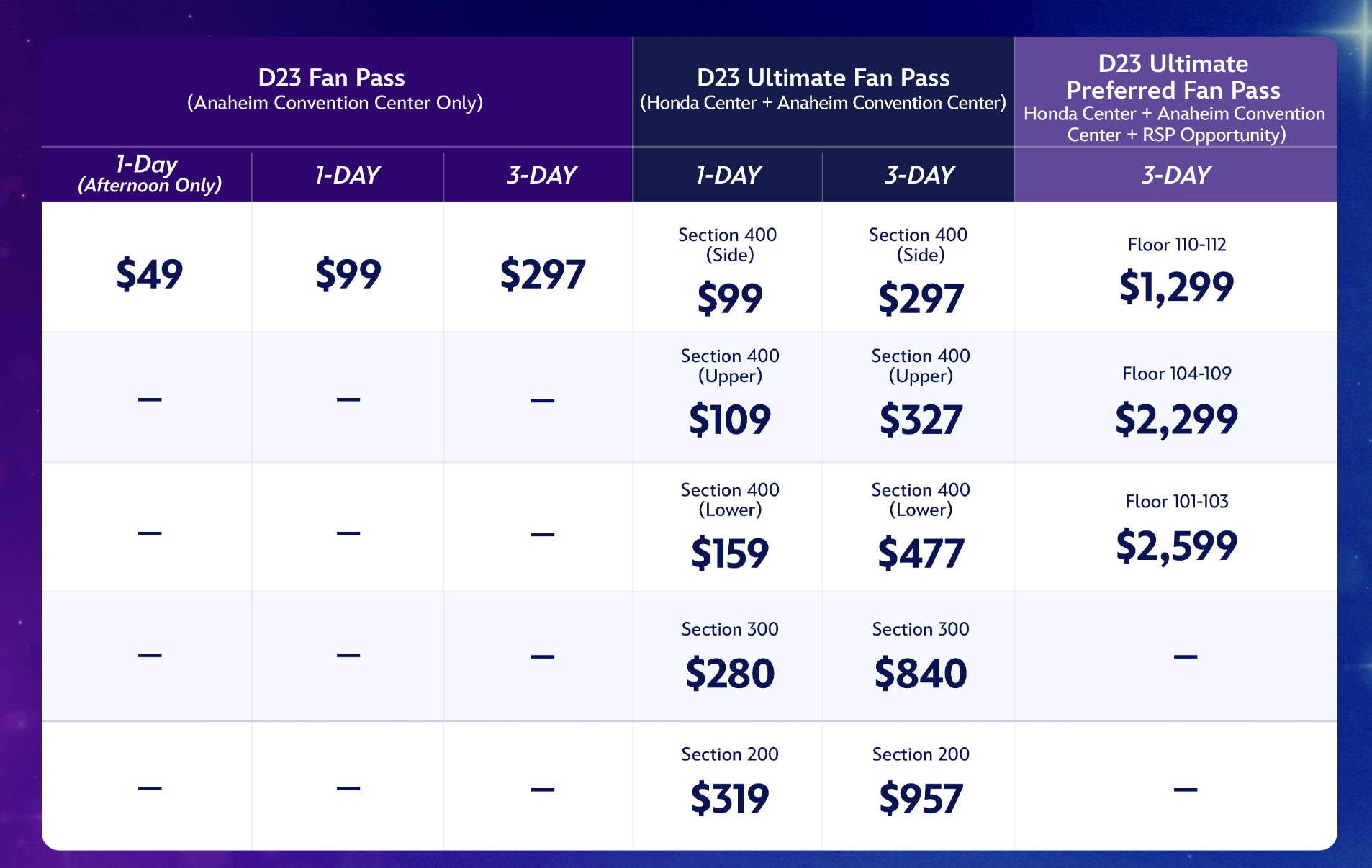 The D23 Ultimate Fan Pass has two levels — regular and preferred. The D23 Ultimate Preferred Fan Pass gets prime seating at the showcases and RSP access to limited edition pins. With the regular Ultimate Fan Pass, you’ll get seating for the showcases in the 200 or 400 levels.