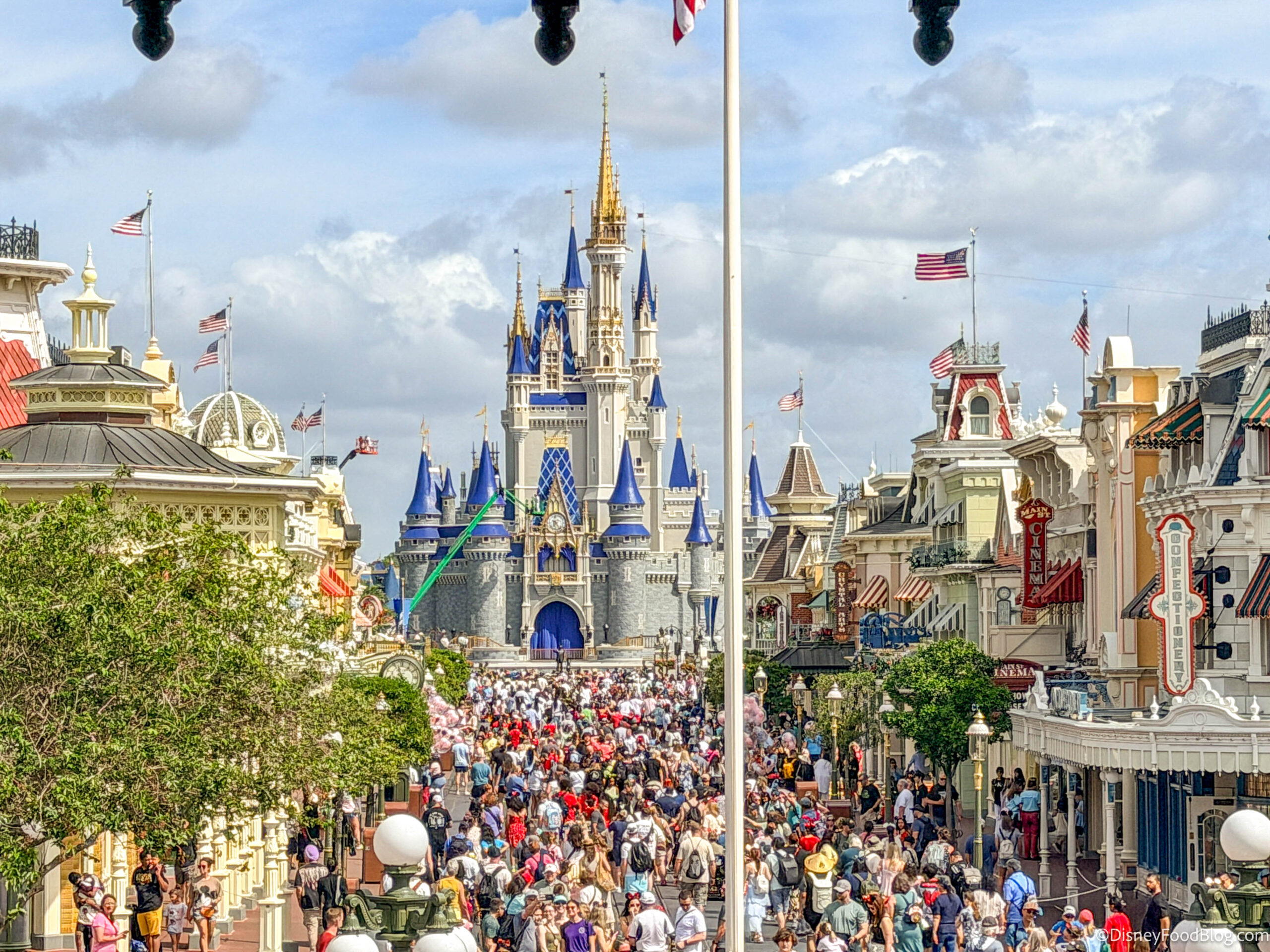 We went up on the Main Street, U.S.A. Train Station to get a POV from that direction, and things are just as busy from this angle! Work continues on the repainting of Cinderella Castle this morning, so you may want to wait until later in the day to grab a castle photo — nobody wants the equipment in the background.