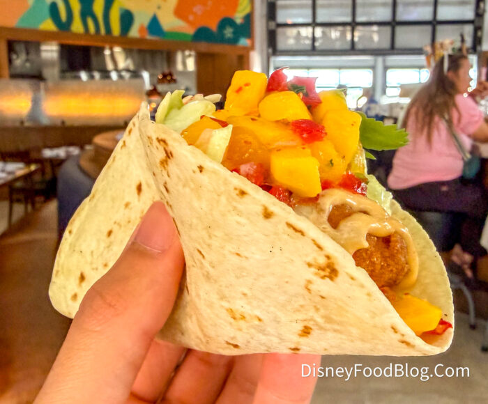 We would have liked to see more fish in the tacos themselves because the small pieces of meat were overwhelmed by the coleslaw and mango salsa. They were also pretty messy to enjoy. They fell apart as we took bites, and we ended up eating it mostly with a fork. These were unique, but if you’re looking for a protein-heavy taco, this might not be it.
