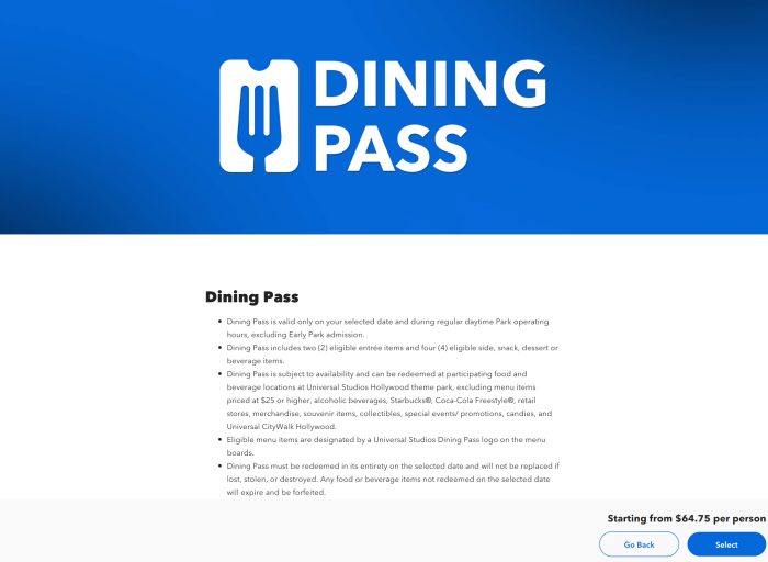 The Dining Pass is only valid for your selected dates and is excluded from Early Park Admission. The pass can be redeemed at park locations, excluding menu items priced at $25 or higher, alcoholic beverages, Starbucks, Coca-Cola Freestyle, retail stores, merchandise, souvenir items, collectibles, special events and promotions, candies, and Universal CityWalk Hollywood. You can find which menu items are eligible with the Universal Studios Dining Pass logo.