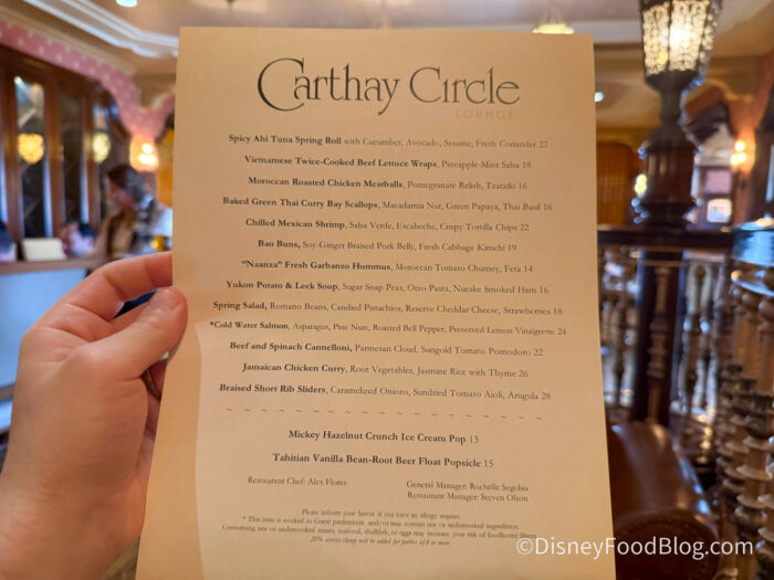 - YOU WANT SOMETHING MORE THAN REGULAR THEME PARK FOOD. This is part of the Carthay kitchen, which offers signature dining. This lounge is not your mere bar food quality…