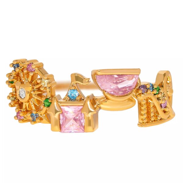 There’s a Disney World version, too, but this one is on a ring. It has the castle, Spaceship Earth, Tower of Terror, and the Tree of Life. We love the blue, green, clear, and amber faceted cubic zirconia, which are the gems intermixed into the icons.