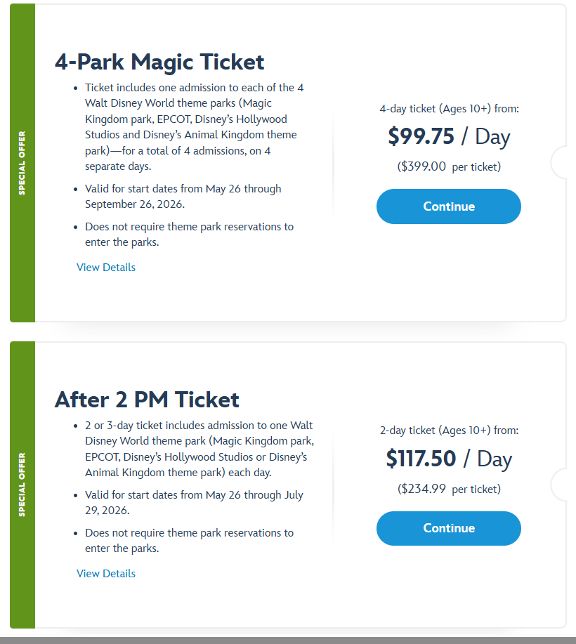 So here’s the ticket deal Disney released: you can get a discounted theme park ticket for two or three days for all four parks with admission to one park per day after 2 PM. This ticket is valid from May 26th through July 29th. Pricing for the tickets depends on the start day, but a 2-day ticket runs anywhere from $118 per day to $156 per day, while a 3-day ticket runs from $116 per day to $154 per day.