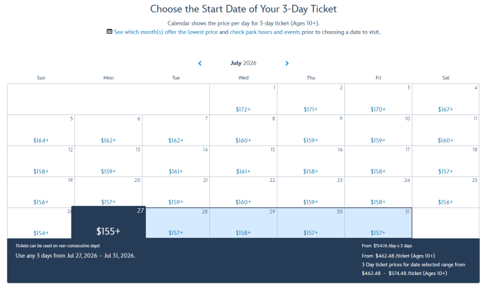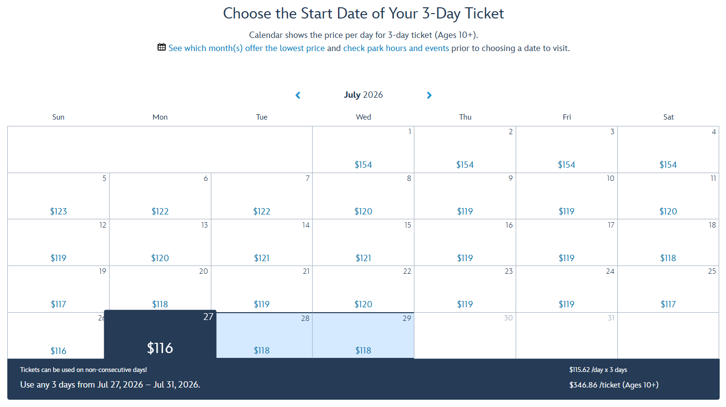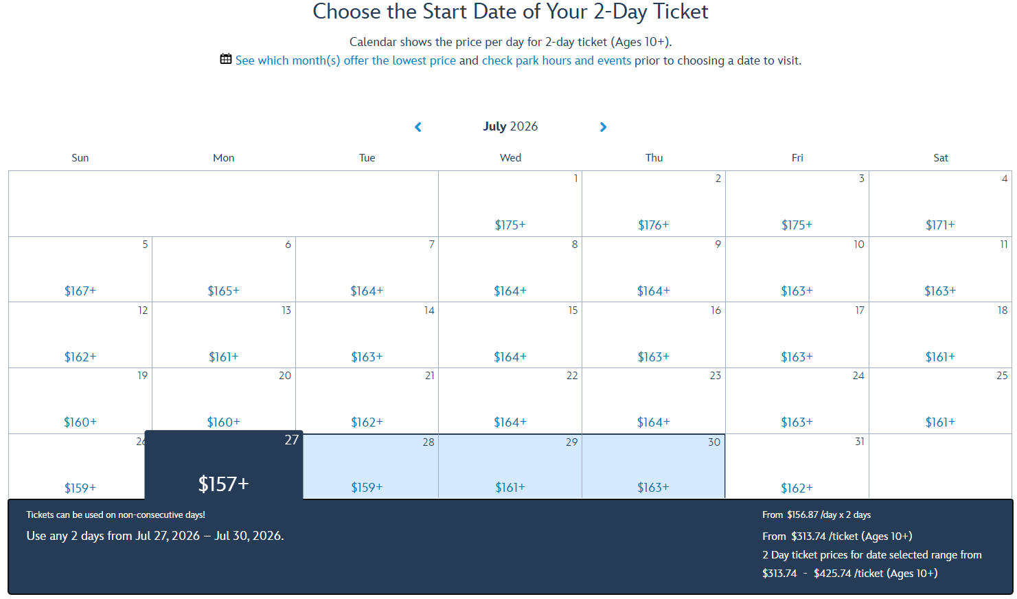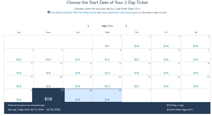 In comparison, the ticket price for a 2-day ticket for visits after 2 PM starting on July 27th is $118 per day.