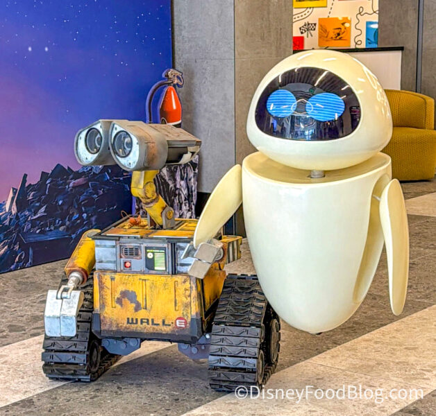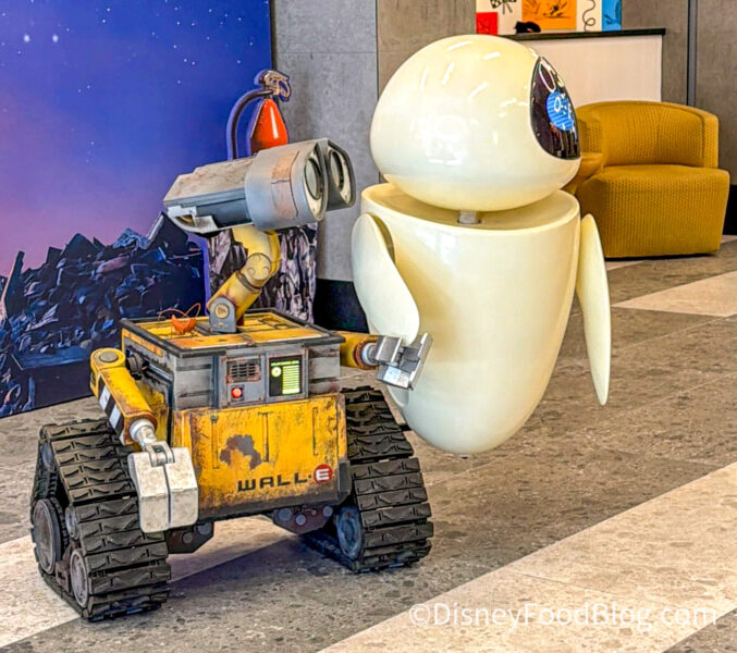 WALL-E and Eve have popped up at the Pixar Place Hotel in celebration of Earth Month, and we couldn’t be more thrilled! Of course, we had to stop by and say hi to the loveable robots, and not to be dramatic, but we seriously can’t get over our interaction with them — they’re just so dang cute!
