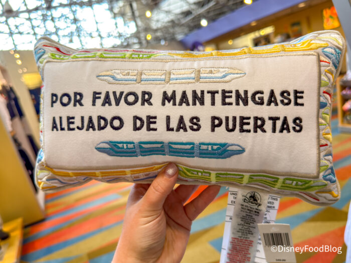 The Contemporary Resort is known for the iconic monorail running through the middle of it, and we love a souvenir that reflects that! We found this Embroidered Monorail Pillow for $49.99. It has the classic “Please stand clear of the doors” quote on the front in Spanish!