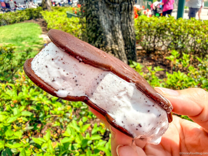 Like usual, the cookies were soft and easy to eat while the ice cream itself was smooth and creamy. Delicious cookies and cream flavor — honestly, this is an unsung hero of the Disney World snack carts, and we think it deserves more hype!