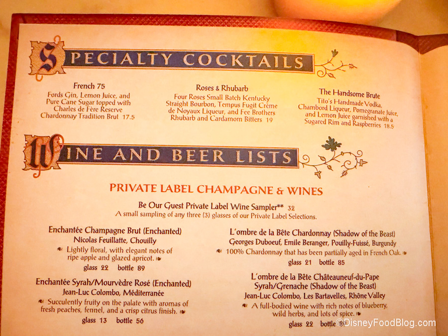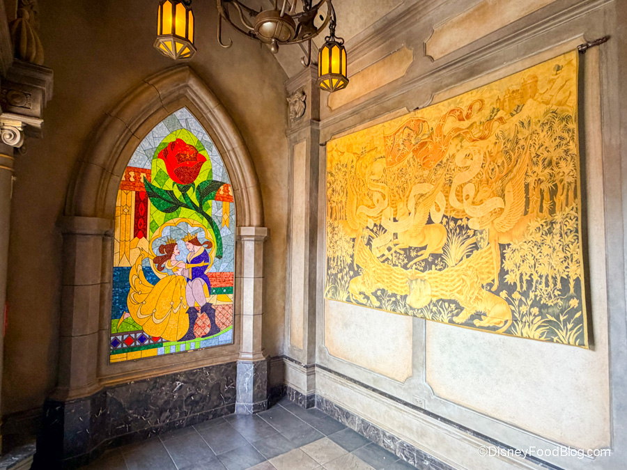 Once inside, you’ll be taken to one of three themed dining rooms: The Grand Ballroom, The West Wing, or The Rose Gallery. Each room has a beautiful design that you’ll want to explore each to find all the hidden Beauty and the Beast details.
