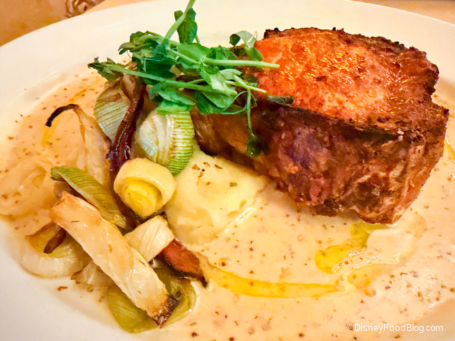 For our entrée, we chose the Dry-Aged Duroc Pork Chop, which is not our usual order here. It’s served with Garlic Confit Mashed Potatoes, Root Vegetables, and Whole-Grain Mustard Sauce. So we’ll admit that this surprised us! We ended up with a perfectly cooked pork chop and smooth and creamy mashed potatoes with just the right amount of garlic. The root vegetables added a nice balance, and we loved getting that onion flavor from the leeks.