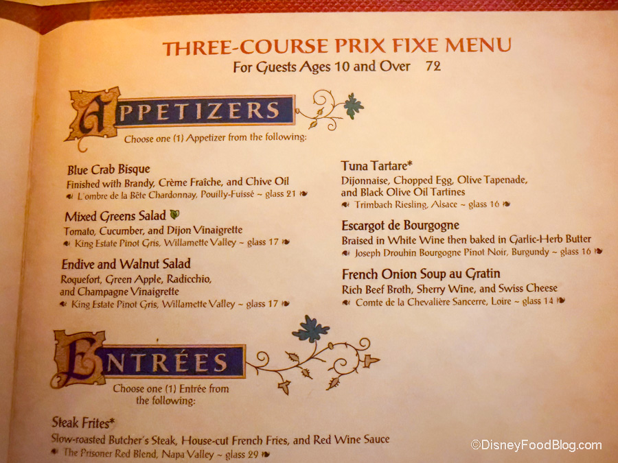 Be Our Guest offers a prix fixe menu for both lunch and dinner that costs $72 per adult and $43 per child. Adults get one appetizer, one entree, and one dessert, while kids get to choose one appetizer, one entree with two sides, and one dessert. Let’s look at the adults’ menu. Current appetizers include soups, like Blue Crab Bisque and French Onion soup.
