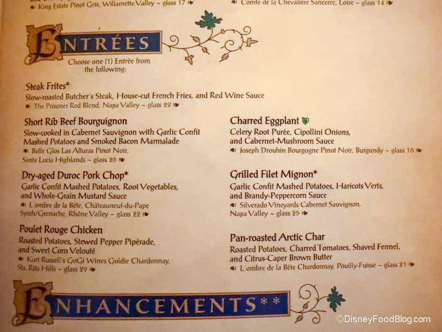 - Don’t like Prix Fixe meals. This restaurant is pricey, and yes, you get three courses, but honestly, it’s a lot of food, and you’re locked down into ordering all three courses. That means you probably won’t eat all of what you’re served, so you can still have some room by the time dessert arrives. That also means that this meal will take time out of what might already be a busy Magic Kingdom day.