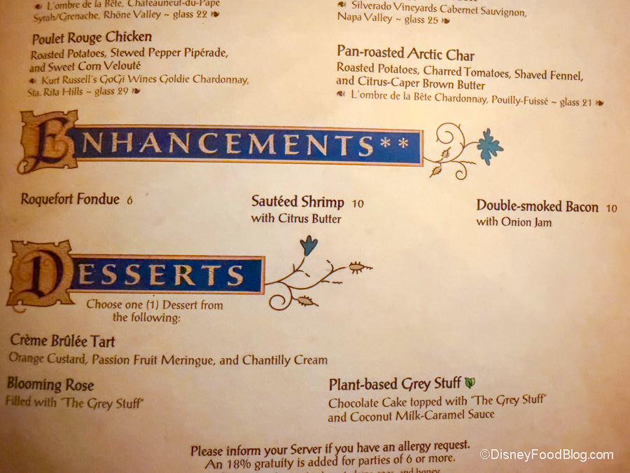 You can also add enhancements to your meal for an additional cost, like bacon, shrimp, and fondue. Desserts include a Blooming Rose, a Creme Brulee Tart, and a plant-based version of the Grey Stuff.