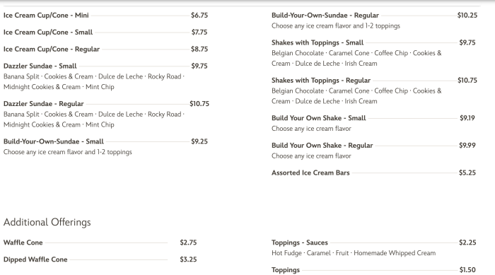 There isn’t any designated seating for this spot, but there are community tables nearby. During busy seasons, it may be hard to find a spot, and there’s virtually no shade right nearby, so keep that in mind. We know there’s ice cream on the menu here, but what exactly can you get?