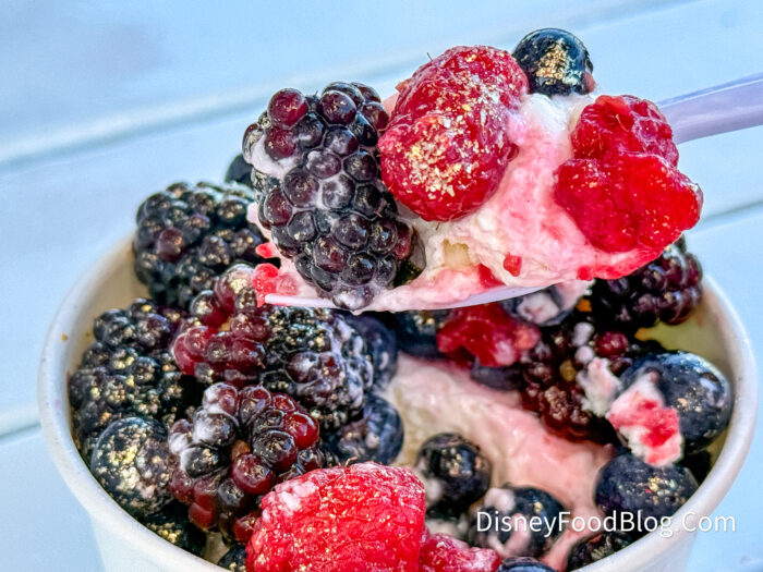 Once we mixed the berries into the cheesecake, we enjoyed it more! This can get a bit messy when you mix it, so something to be wary of. It was sweet and even had some gold flakes on top for extra shine.