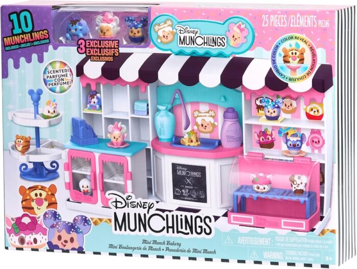 This collectible toy set features 1 Bakery playset, 10 Munchlings toy figures, 1 carousel display, 1 bakery case with rack, 1 refrigerator case, 1 cash register, 1 pair of tongs, 2 napkins, 2 trays, 2 plates, 1 syrup bottle squirter, and 1 piping bag squirter, all of which is everything kids need to pretend play managing a bakery.