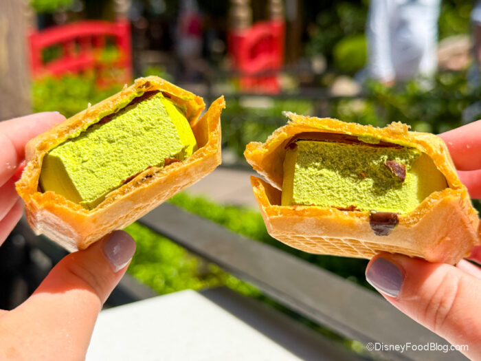 However, the matcha ice cream filling has a strong, earthy flavor that makes it unique, but it’s also a little bitter (and, well, matcha is generally an acquired taste, to begin with). There is a thin chocolate coating inside the wafer that helps sweeten it up, but it’s not spread very evenly, so you don’t get it in every bite.