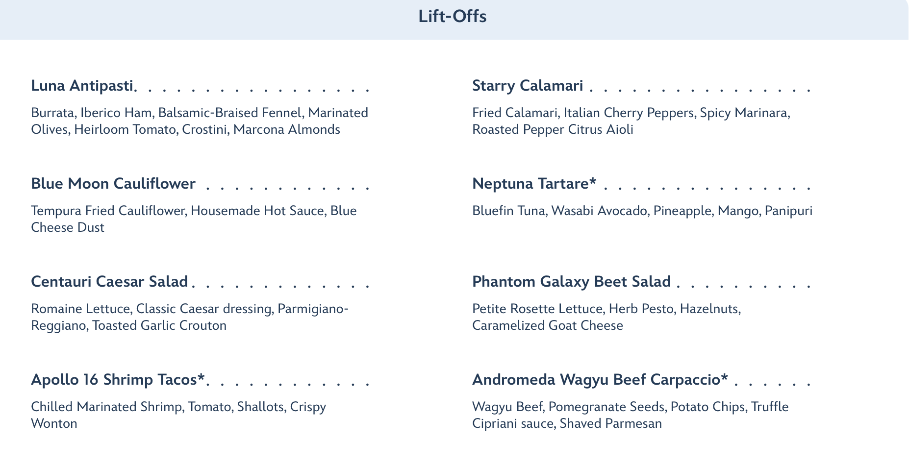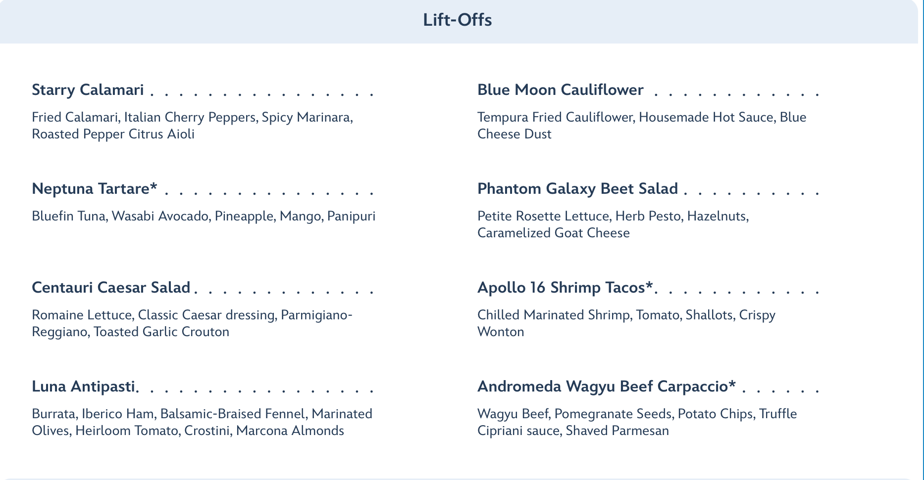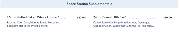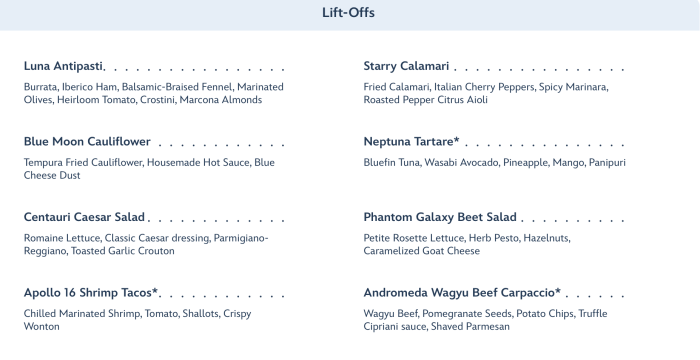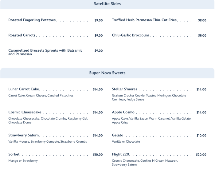 Moving from lunch to dinner, the cost jumps to $79 a per adult but now includes a Super Nova Sweets dessert. The Lift-Offs….
