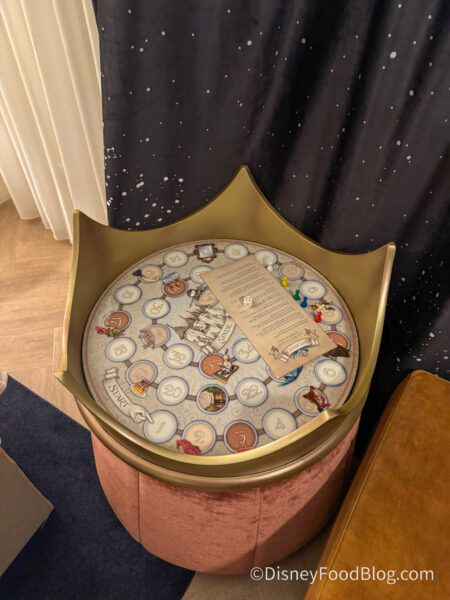 There is a small seating area with a bench and some pillows, but the theming really gets going with a crown-inspired stool that doubles as a game!