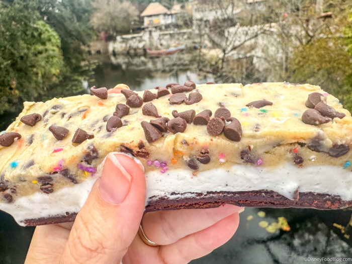 If you haven’t heard of the Cookie Dough Brownie Ice Cream Sandwich over at Terra Treats in Animal Kingdom, consider yourself warned! This new snack is going viral — and for good reason. It’s a brownie layered with vanilla ice cream, topped with chocolate chips and edible cookie dough for $8.29, and while that might not sound all that interesting, this thing definitely lives up to the hype!