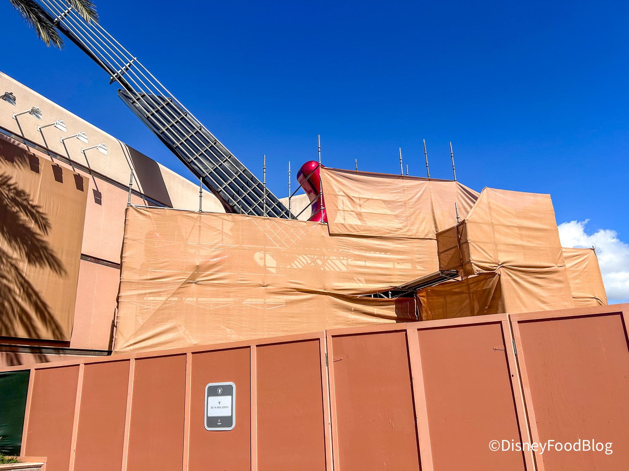 Disney has already made tons of progress on the new version of this iconic attraction! The previous name of the ride has already been removed from multiple locations, including on the guitar, which is now behind the scrim and scaffolding.
