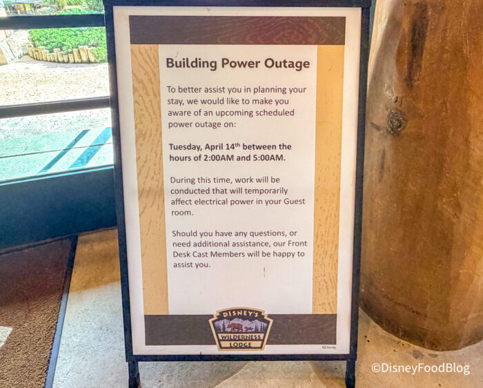Okay, so here’s the deal, friends. There will be a scheduled power outage at the Wilderness Lodge hotel on Tuesday, April 14th, between the hours of 2 AM and 5 AM. During this time, work will be conducted that will temporarily impact electrical power in the guest rooms.