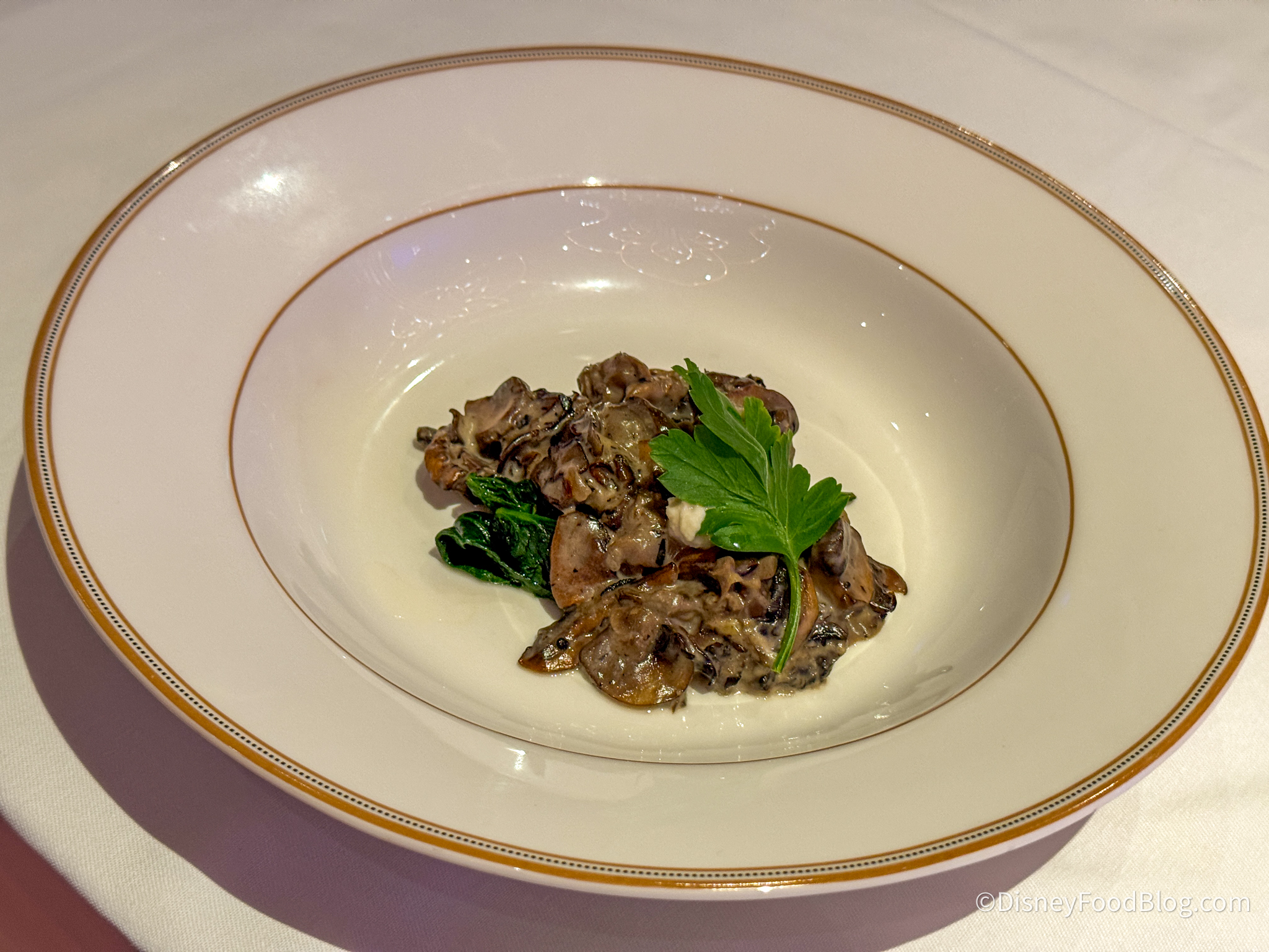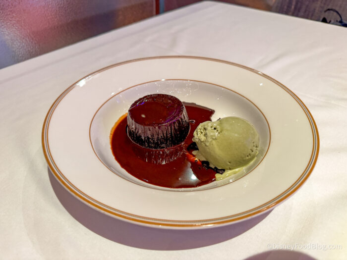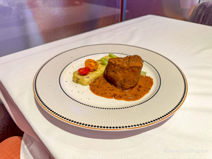 Next was the main event, which was the Peppered Filet Mignon, and this was fantastic! In fact, we could not believe that this steak was from a rotational dining spot. It was one of the best steaks we’ve had on Disney Cruise Line as a whole. It was a high-quality cut, had a char on the outside, and was perfectly cooked to the medium rare we requested. The peppercorn sauce was tangy, creamy, and rich, and the vegetables were also cooked well — it totally blew us away!