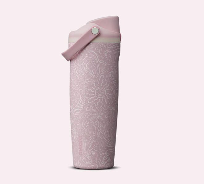 This is the first of the collection’s more “quiet” options! This design features interlocking features like palm trees, suns, sea shells, oysters, and more. It’s a soft pink color and features the famous FreeSip spout that lets you sip or swig. The lid is leak-proof and comes with a carrying handle, making it easier to take on the go. It has triple insulation, so your drinks will be cold for hours!