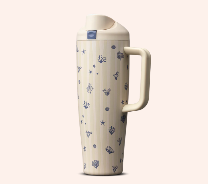 Next up, we have the 40-ounce Coral Cabana design! This design is about feeling quieter and more relaxed. The overall pattern is soft stripes with bits of coral and starfish scattered across it. This cup is also stainless steel and triple insulated. It has the classic Leakproof Lid and sip or swig qualities. It’s also BPA, lead, and phthalate-free!