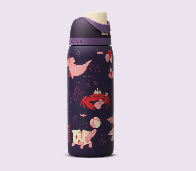 The team described this water bottle as the collection’s wild card! This cup stands out amongst the collection due to its dark colors and big pattern design. This unexpected bottle features a King Crab, “Flying Fish,” and more unique characters. This bottle was designed for both kids and adults to love. It’s a 32-ounce free sip bottle with the features we love. Plus, it has a dishwasher-safe lid and a hand-washable cup!