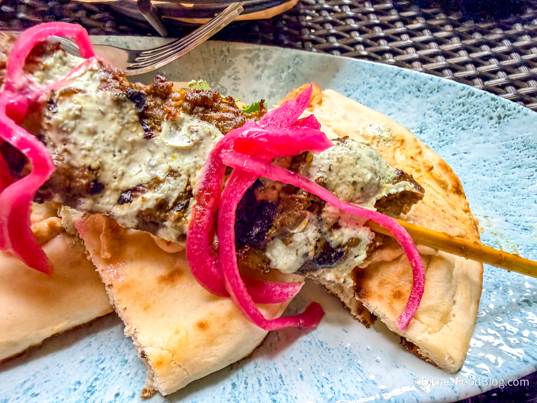 Next, we grabbed the Grilled Beef Kefta for $17, which is a Middle Eastern-inspired Beef Skewer, Harissa Hummus, Herb-Honey Yogurt, Pickled Red Onions, and Naan. The beef is on the saltier side, but still beautifully seasoned. The herb honey yogurt sauce helps keep it from being too salty and helps calm down a bit of the spice as well. The harissa hummus was delicious and not too spicy, and while it was good, it wasn’t our favorite dish of the day. This was largely due to the fact that the naan at the bottom of the dish was saturated with hummus and meat juice, making it soggy. We would have preferred for it to be served on the side with a side of hummus, to enjoy it more as a side.