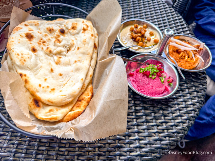 First up, we grabbed the Naan and Dip Trio for $17, which is Warm Onion Naan paired with Roasted Garlic Hummus, Roasted Eggplant and Beetroot Spread, Roasted Red Pepper and Walnut Muhammara.
