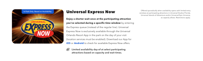 Meet the Universal Express Now. It lets you skip the line of a single attraction within a certain time frame. You’ll need to purchase it on the day of, and you need to be inside the park for it to work. You can grab the Universal Orlando Resort App.
