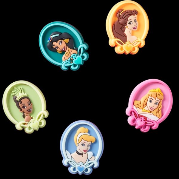 Pop some personality into your shoes with these Disney Princess 5 Pack Jibbitz charms. They’re the perfect addition to your new pair of ears, clogs, slides, and more! The set features Cinderella, Belle, Jasmine, Aurora, and Tiana.