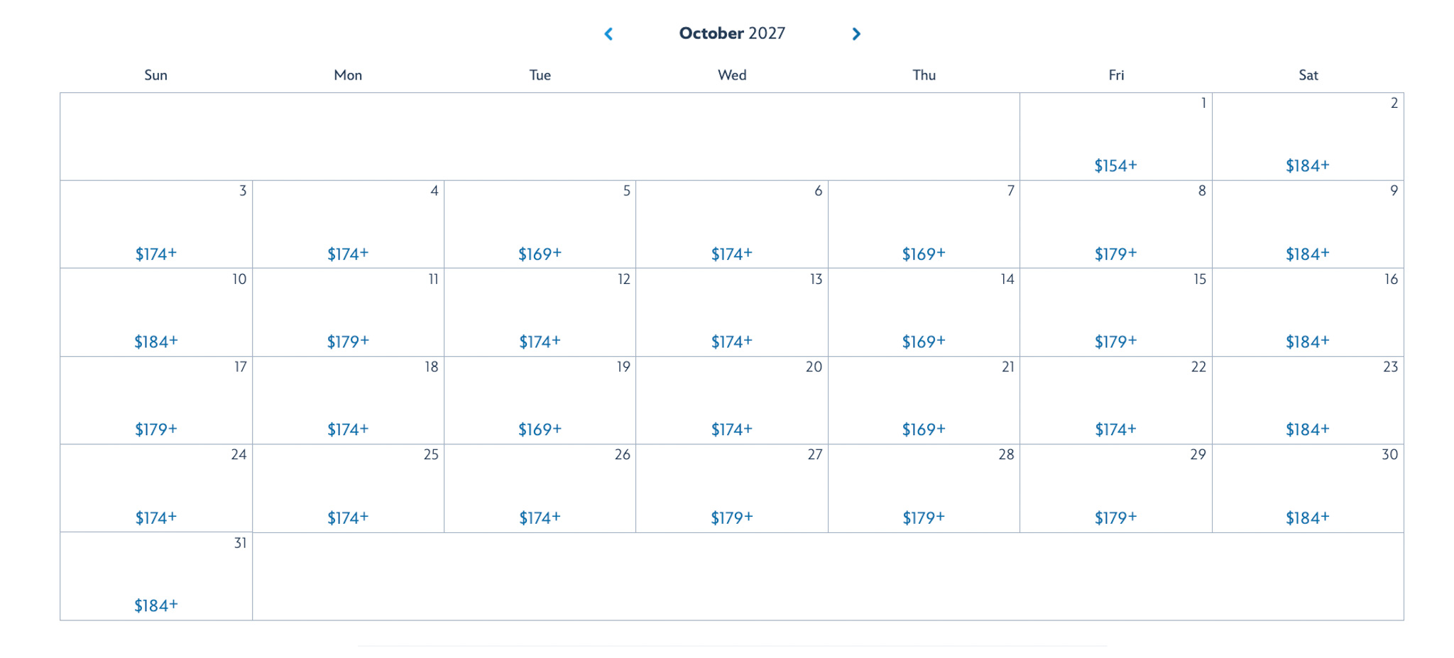 During October, the cheapest ticket price for a 1-day, 1-park ticket starts at $154, depending on the day: