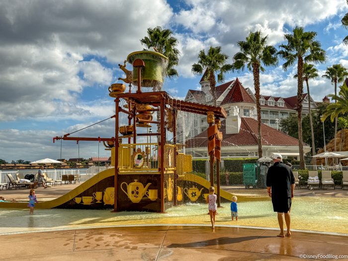 Any Disney hotel features adjacent water play areas, with fun theming and water features. However, these areas are reserved for kids who stand 48″ or under. So, no older kids, no teens, and no adults.