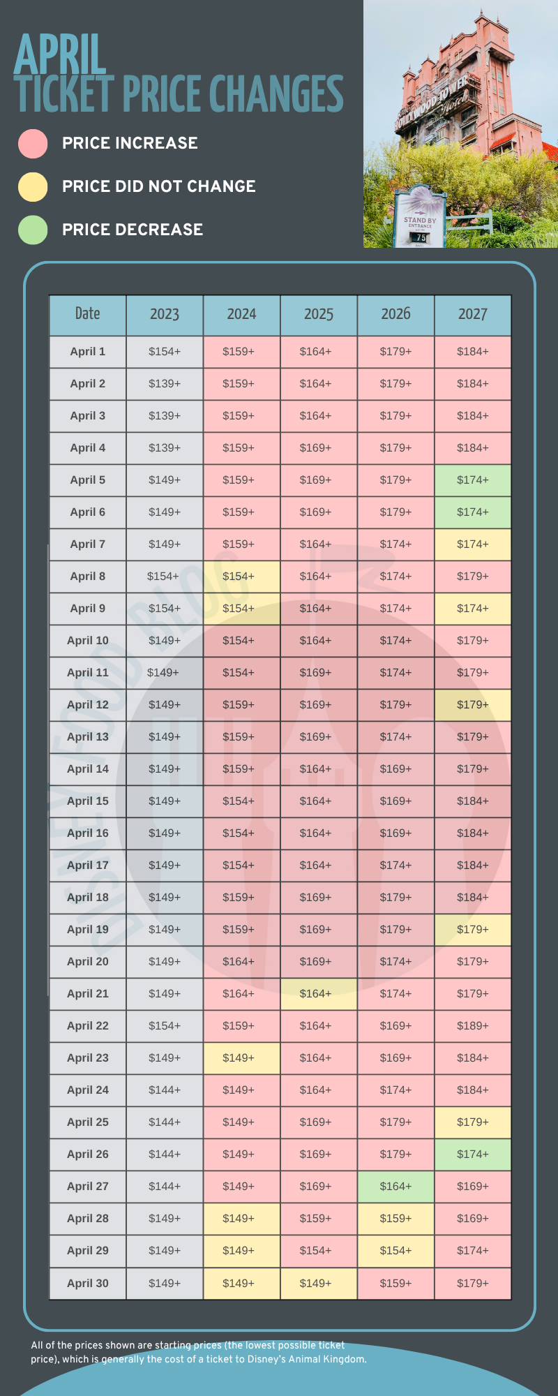 Most days in April 2027 will see a ticket price increase, but we did notice that three days have a lower price than they did in 2026: April 5th, 6th, and 26th. Five days will remain the same as in 2026: April 7th, April 9th, April 12th, April 19th, and April 25th.