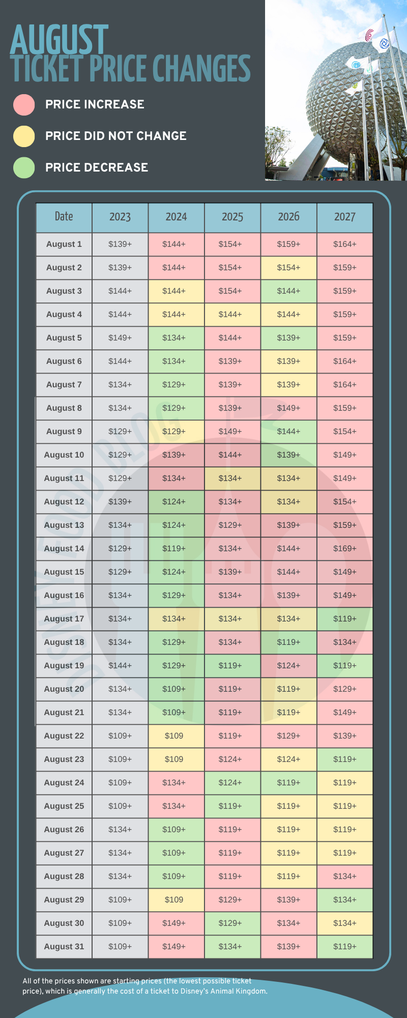 August 2027 will see ticket price increases, too, with a lot of those being earlier in the month. However, five days will go down in price: August 17th, 19th, 23rd, 24th, and 25th. We are also noticing that five days remained at the same price as they were in 2026: August 24th, 25th, 26th, 27th, and 30th. August has eight days at the lowest price of $119 per ticket, with no dates at the highest price.