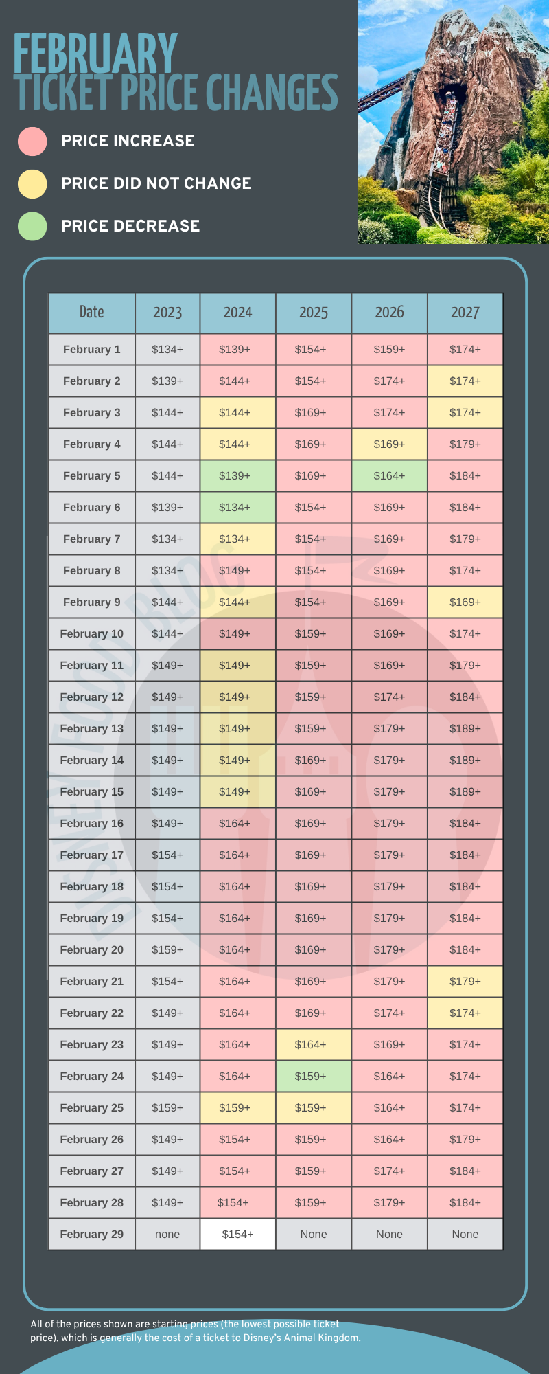 In February, we’re seeing quite a few days change in price, while five dates will stay the same from 2026: February 2nd, 3rd, 9th, 21st, and 22nd. Three dates are at the highest price of $189 per ticket, with no dates at the lowest price.